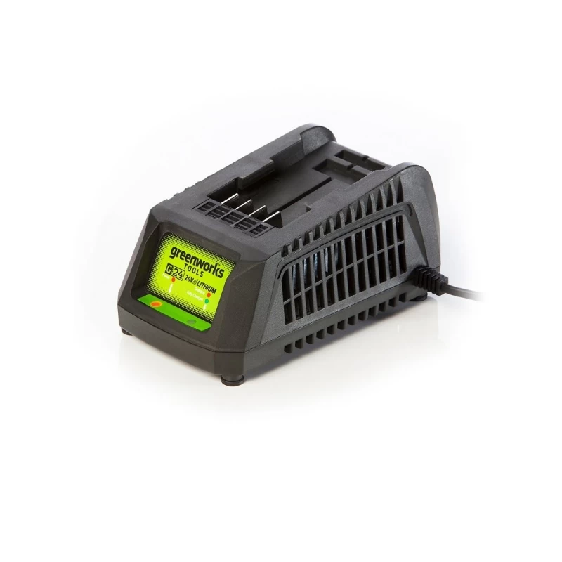 De Greenworks 24 volt acculader type G24C (voorheen 29817) is geschikt voor het laden van 24 volt lithium ion accu’s. Laadtijd van 2.0Ah accu’s 45 minuten en 4.0Ah accu’s 90 minuten.