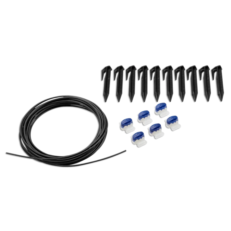Inclusief 5 meter begrenzingsdraad, 6 waterdichte koppelingen en 10 klemmen.