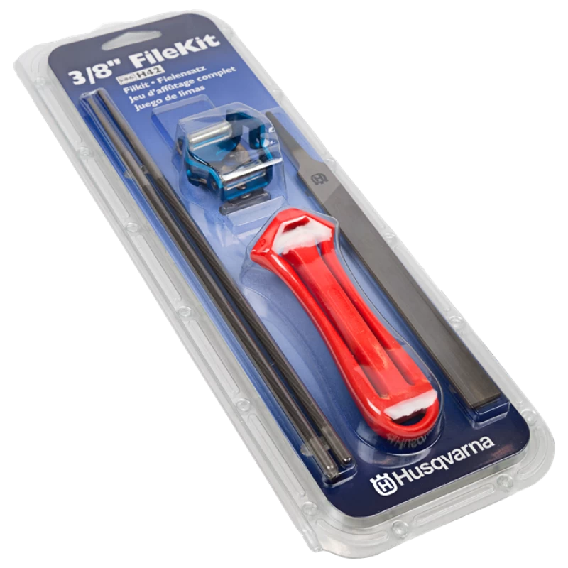 Complete vijlkit om het werk simpeler te houden. Met een correct geslepen ketting, zult u veiliger en comfortabeler werken. De vijlkit bestaat uit een vijlhandvat, combimal of vijlmal met een dieptesteller, twee ronde vijlen en een platte.