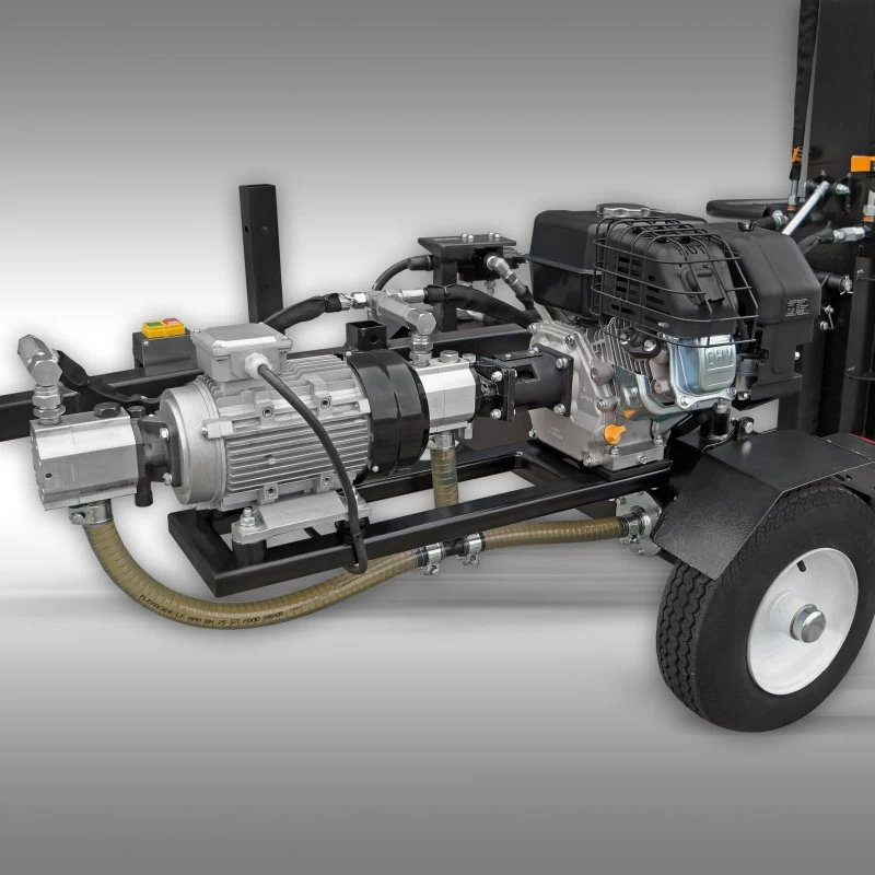 De hydraulische pomp wordt aangedreven door een zeer robuuste, hoogwaardige Kohler-benzinemotor van 6,5 pk of een krachtige elektromotor (400 V, 2,2 kW). U kunt vrij kiezen tussen elektrische aandrijving of benzineaandrijving..